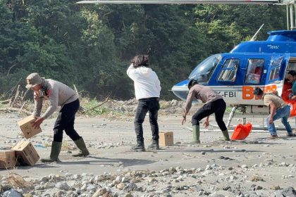 Remidia | Bener Meriah — Personel Polri dari Satbrimob Polda Aceh yang tergabung dalam Penugasan Aman Nusa II BKO Polres Bener Meriah membantu proses penurunan bantuan sembako dari helikopter Badan Na...