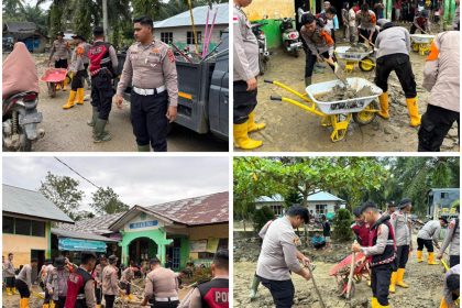 Remidia | Aceh Timur — Polres Aceh Timur bersama BKO Resimen 1 Pelopor Kedung Halang melaksanakan aksi kemanusiaan berupa pembersihan dan gotong royong pascabencana banjir di MIN 15 Aceh Timur, Kecama...