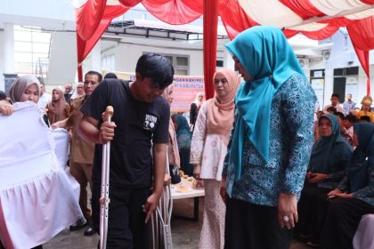 REMIDIA | BANDA ACEH – Ketua TP PKK Aceh Marlina Muzakir, tak dapat membendung rasa bahagianya, saat Munatunnzahra, anak Disabilitas rungu menyerahkan batik tulis karyanya, pada peringatan Hari Disabi...