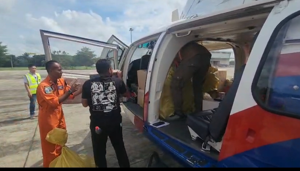 Heli Douphin P-3102 mengirimkan bantuan ke lokasi Bima Patra Aceh Tamiang Posko Polres Aceh Tamiang, jenis bantuan berupa: