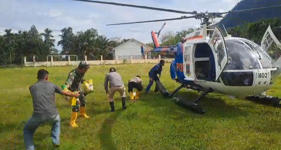 Helikopter Polri Angkut Bantuan Beras 60 sak ke Simpang Jernih Aceh Timur