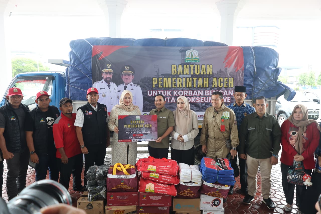 Istri Gubernur Aceh sekaligus Ketua TP PKK Aceh, Ny. Marlina Muzakir, turun langsung ke Lhokseumawe menyalurkan bantuan logistik. Kehadirannya didampingi oleh Plt. Kepala Dinas Sosial Aceh, Chaidir, S.E., M.M., dalam penyerahan yang berlangsung di Halaman Pendopo Wali Kota Lhokseumawe.