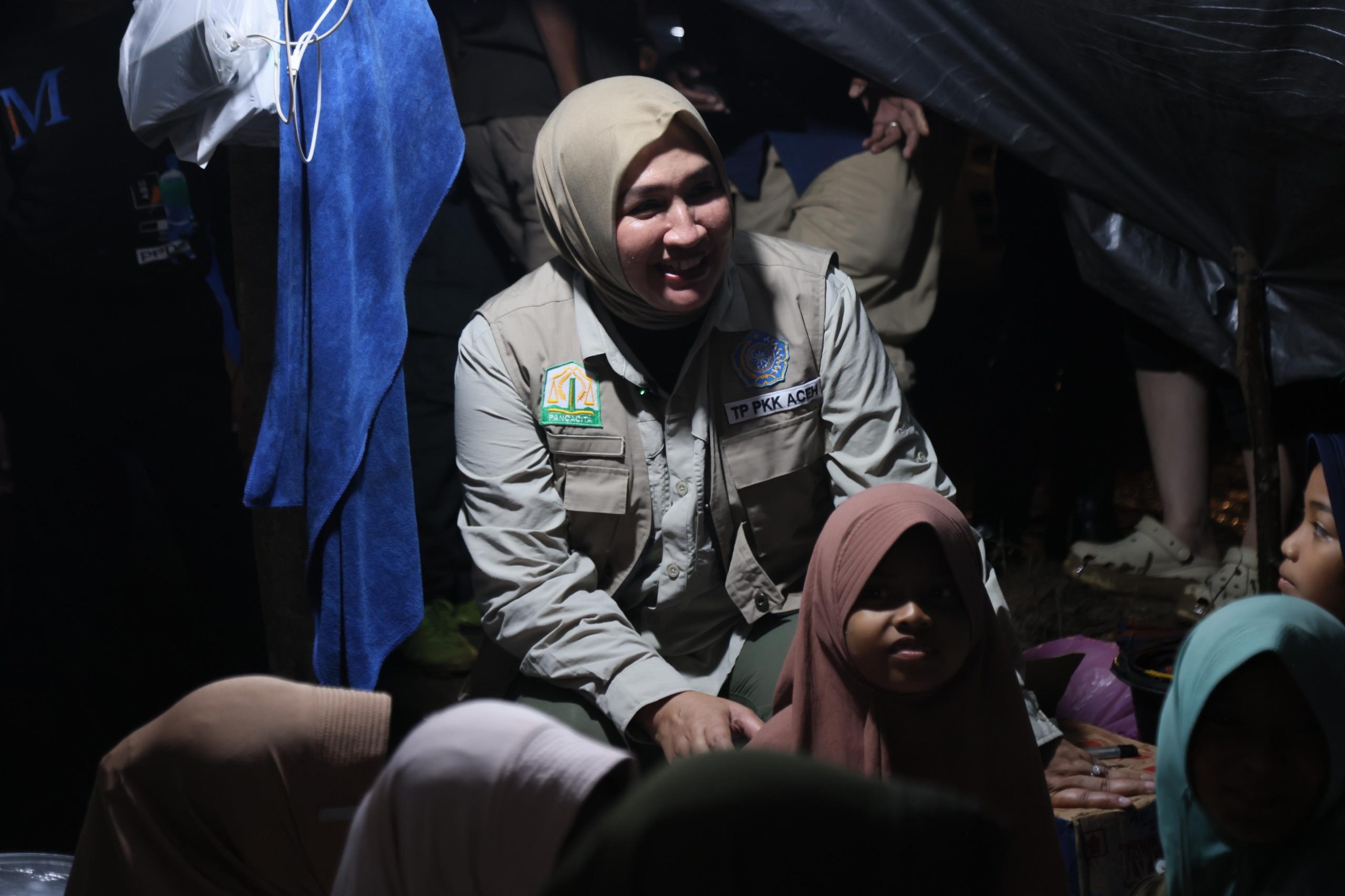 Istri Gubernur Aceh itu juga sempat terenyuh saat melihat anak-anak di posko pengungsian yang tetap menggelar pengajian bersama, meski di lokasi yang kurang nyaman.