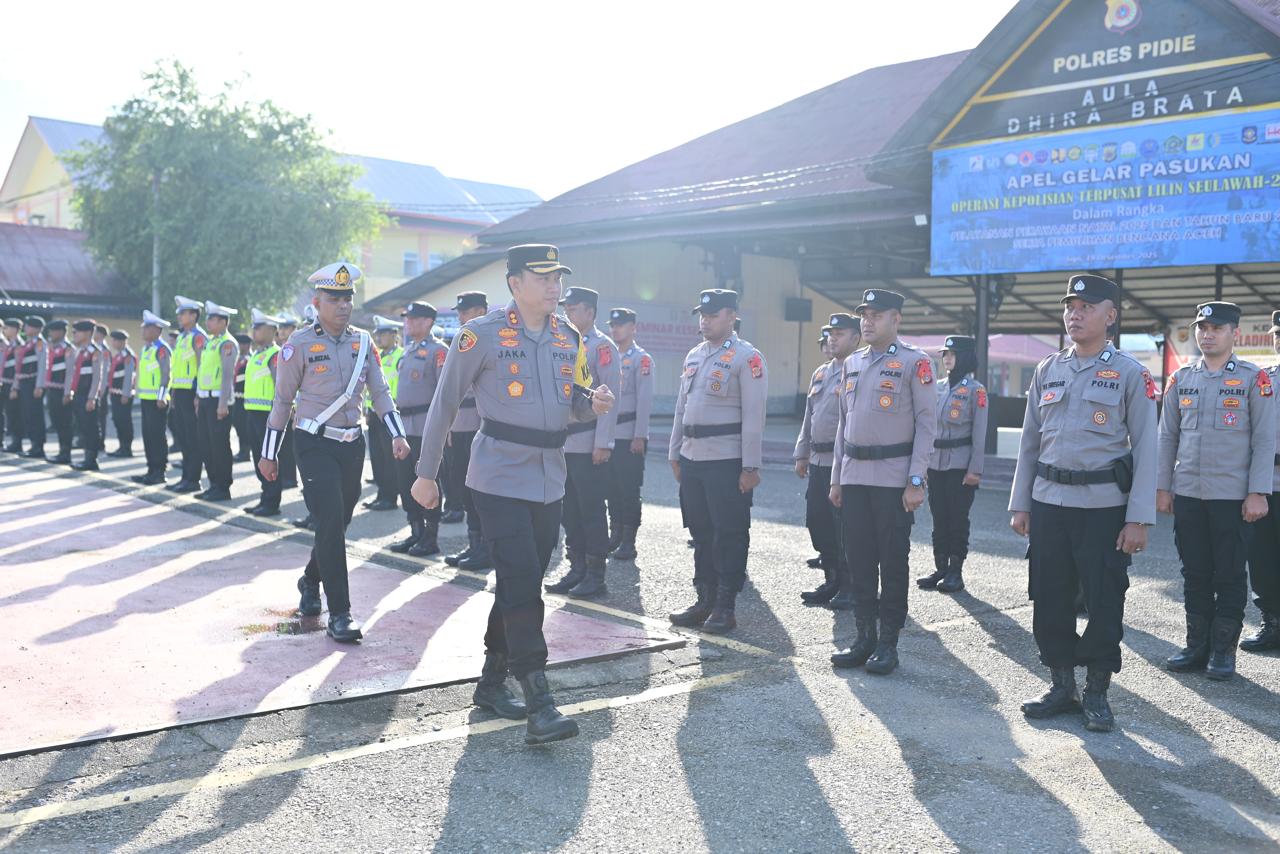 Remidia | Sigli – Polres Aceh Pidie menggelar Apel Gelar Pasukan Operasi Kepolisian Terpusat Lilin Seulawah Tahun 2025 yang dipimpin Langsung oleh Kapolres Pidie AKBP Jaka Mulyana, SIK, MIK, dalam rangka mewujudkan Sitkamtibmas dan Kamseltibcarlantas yang kondusif serta menjamin keamanan masyarakat dalam merayakan Natal tahun 2025 dan Tahun Baru 2026 Serta Pemulihan Bencana Aceh. Yang bertempat di lapangan Apel Polres Pidie. Jumat (19/12/2025)