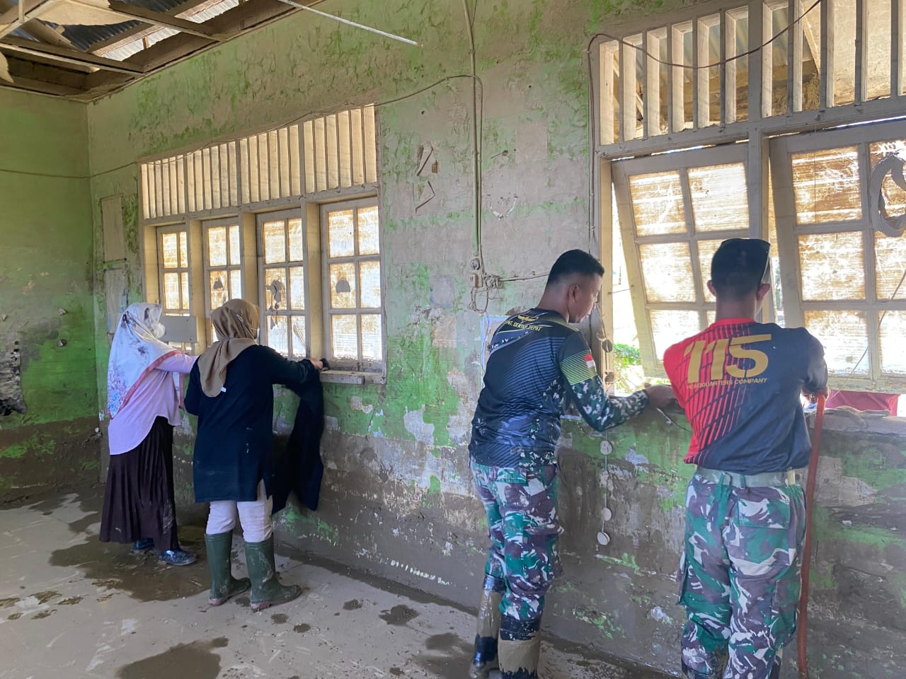 Usai kegiatan interaksi dengan anak-anak, prajurit Satgas Penanggulangan Bencana Yonif 115/ML melanjutkan kegiatan pembersihan fasilitas sekolah. Mereka membersihkan lumpur sisa banjir di ruang kelas, halaman, serta sarana pendukung lainnya agar proses belajar mengajar dapat kembali berjalan dengan normal dan aman.