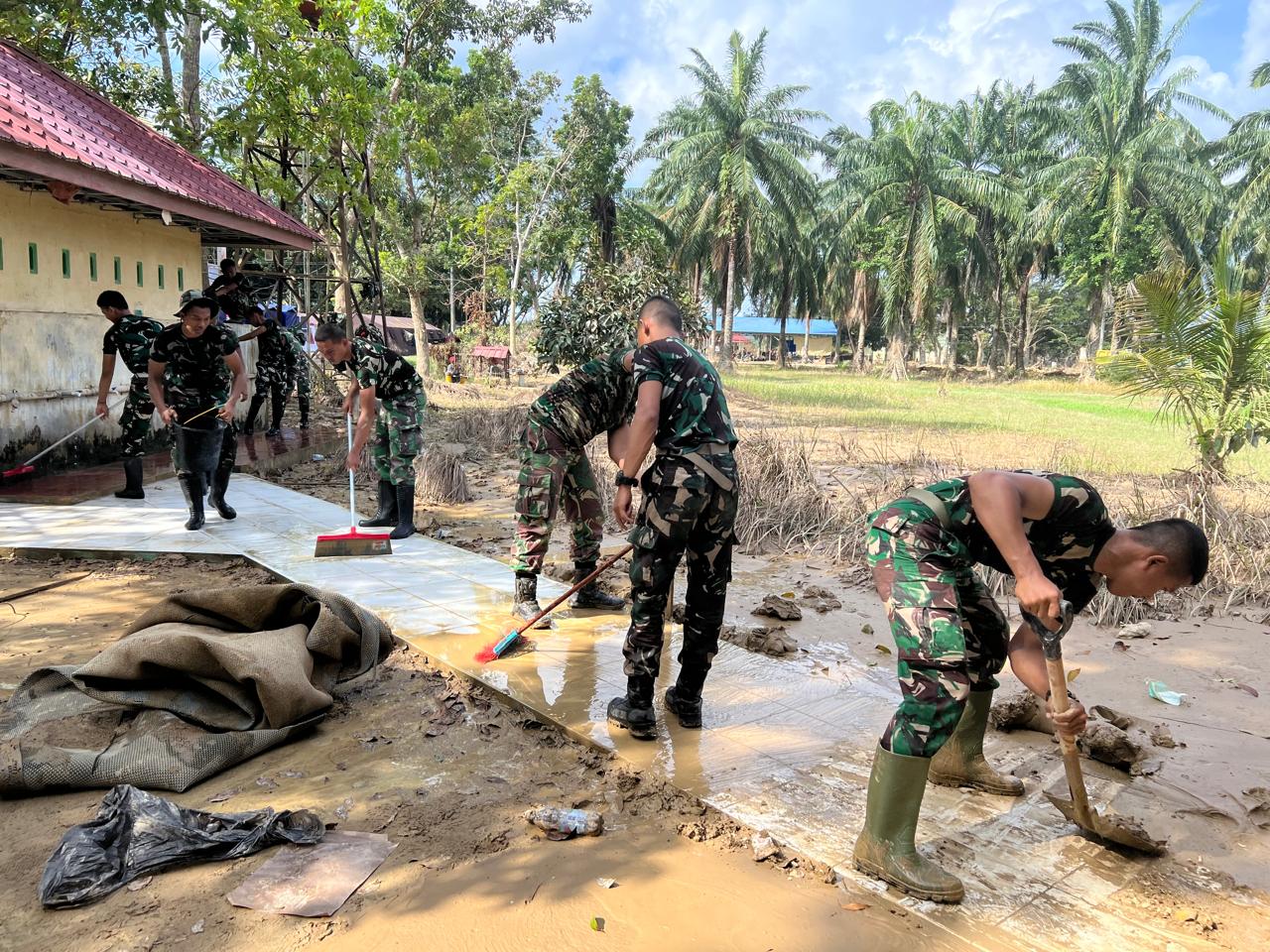 Kegiatan tersebut dilakukan secara bergotong royong, mencerminkan kuatnya semangat kebersamaan antara TNI dan masyarakat dalam menghadapi dampak bencana.