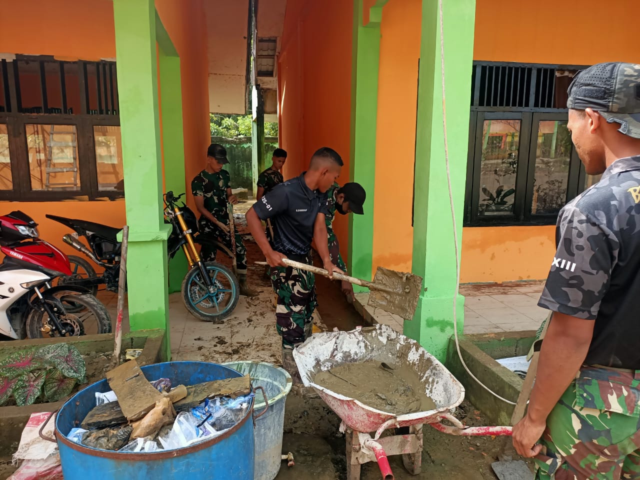“Kegiatan kali ini kami fokuskan untuk pembersihan sekolah, mengingat para siswa akan segera melaksanakan ujian yang sebelumnya tertinggal dibandingkan wilayah lain yang tidak terdampak banjir,” ujar Danposramil.