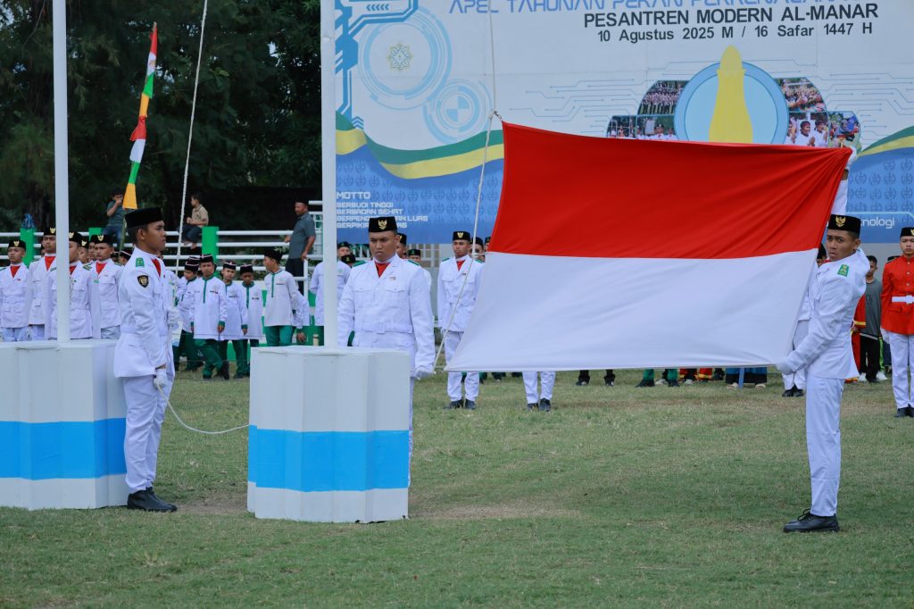 Prosesi pengibaran bendera merah putih pada apel tahunan Pesantren Modern Al Manar di Kecamatan Krueng Barona Jaya, Aceh Besar, Minggu (10/8/2025). FOTO/ MC ACEH BESAR
