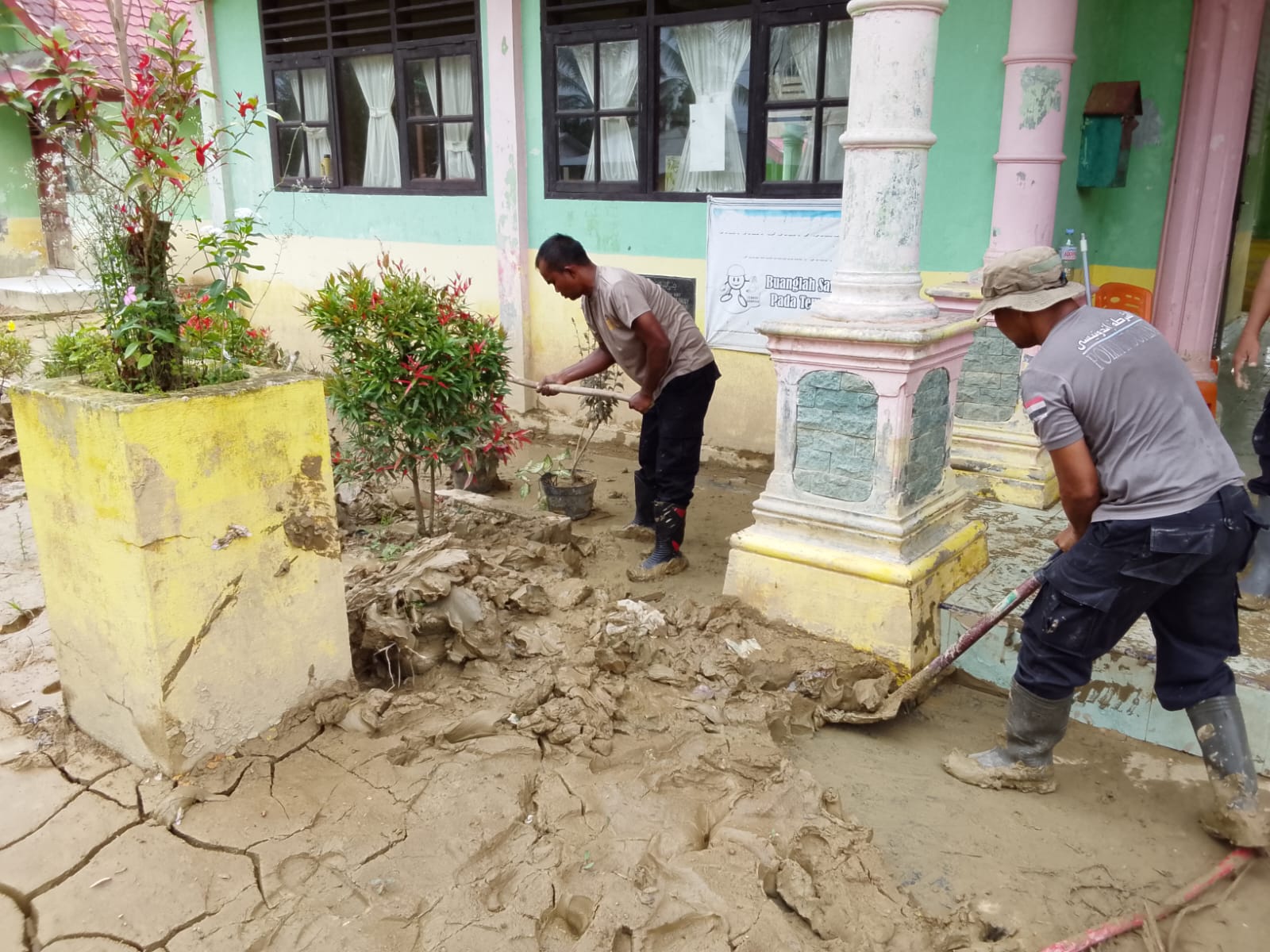 Pembersihan dilakukan sebagai bagian dari upaya pemulihan pascabencana agar fasilitas pendidikan dapat kembali difungsikan.