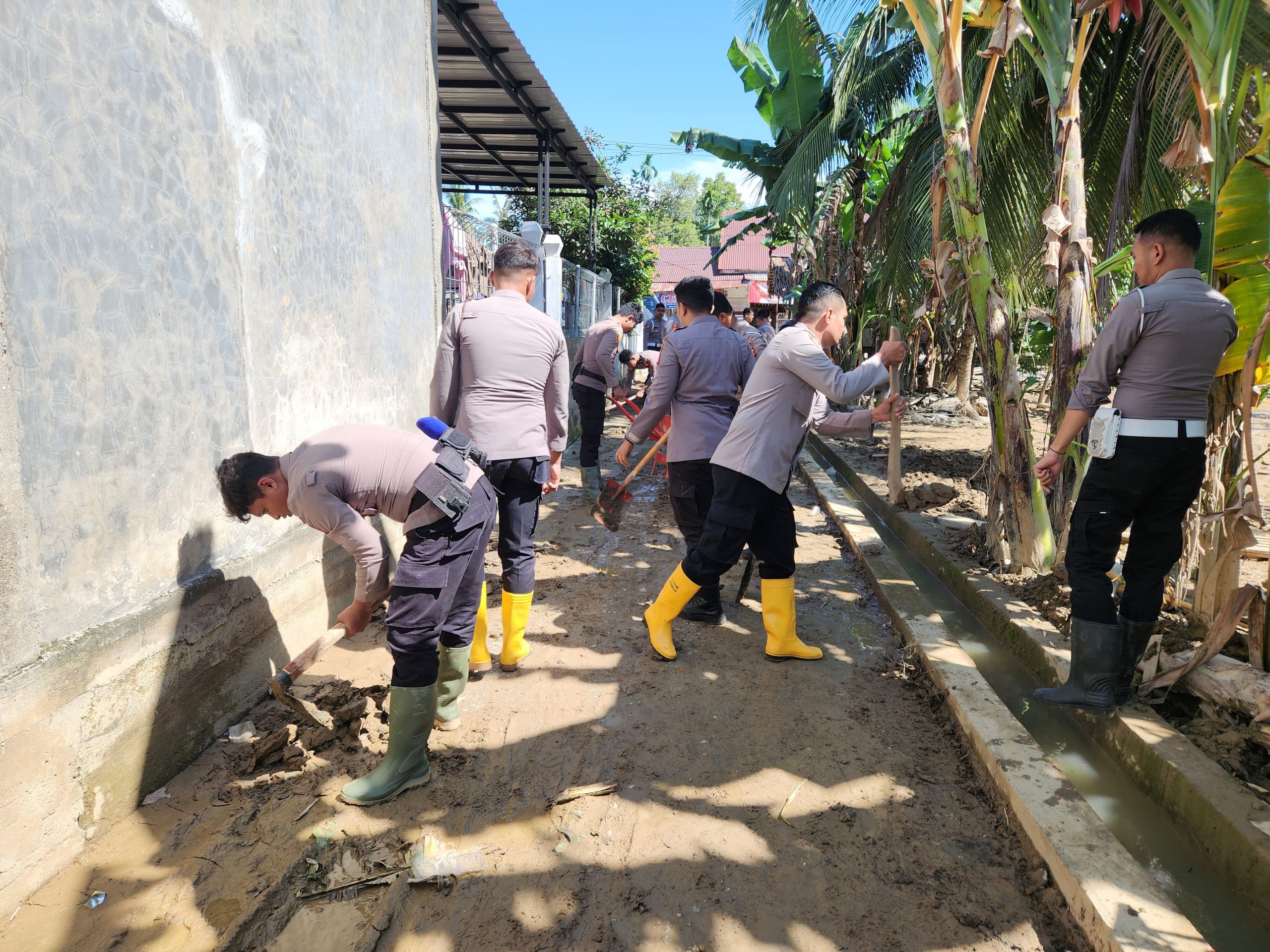 Sebanyak 42 personel Polres Pidie diterjunkan dalam kegiatan tersebut untuk membersihkan badan jalan dari lumpur, sampah, dan material lainnya yang berpotensi menghambat arus lalu lintas maupun aktivitas masyarakat setempat.