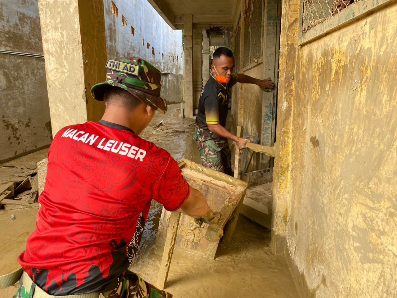 Dengan penuh semangat dan rasa tanggung jawab, prajurit Yonif 115/Macan Leuser turun langsung ke lokasi membawa berbagai peralatan sederhana seperti cangkul, arco, dan sekop. Secara bergotong royong, para prajurit membersihkan lumpur yang mengendap di dalam ruang kelas, menyapu halaman sekolah, membuka saluran air yang tersumbat, serta mengangkat puing-puing kayu dan material lain yang terbawa arus banjir.