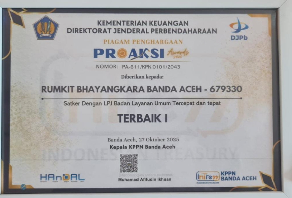 “Rumkit Bhayangkara meraih peringkat pertama Penghargaan Proaksi Triwulan III Tahun 2025 dari KPPN Banda Aceh untuk kategori BLU dengan Laporan Pertanggungjawaban (LPJ) Tercepat dan Tepat Se-Provinsi Aceh Tahun Anggaran 2025. Ini menunjukkan bahwa kami berkomitmen terhadap kecepatan, ketepatan, dan integritas dalam setiap proses pelaporan,” ujar dr. Jamal, Kamis, 30 Oktober 2025.