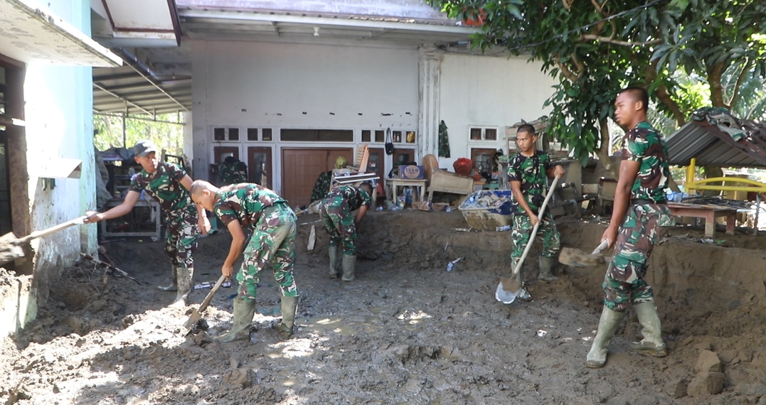 Sejumlah personel TNI yang tergabung dalam satgas penanggulangan bencana alam di dikerahkan untuk melaksanakan pembersihan ruang kelas, halaman sekolah, dan fasilitas pendukung dengan menggunakan peralatan manual serta dukungan alat berat.