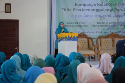 Keterangan foto : Ketua TP PKK Aceh Besar Hj Rita Mayasari, menyampaikan sambutannya, pada pembukaan Kampanye Kolaboratif We Can “Kita Bisa Menanggulangi Perubahan Iklim” yang berlangsung di Gedung UD...